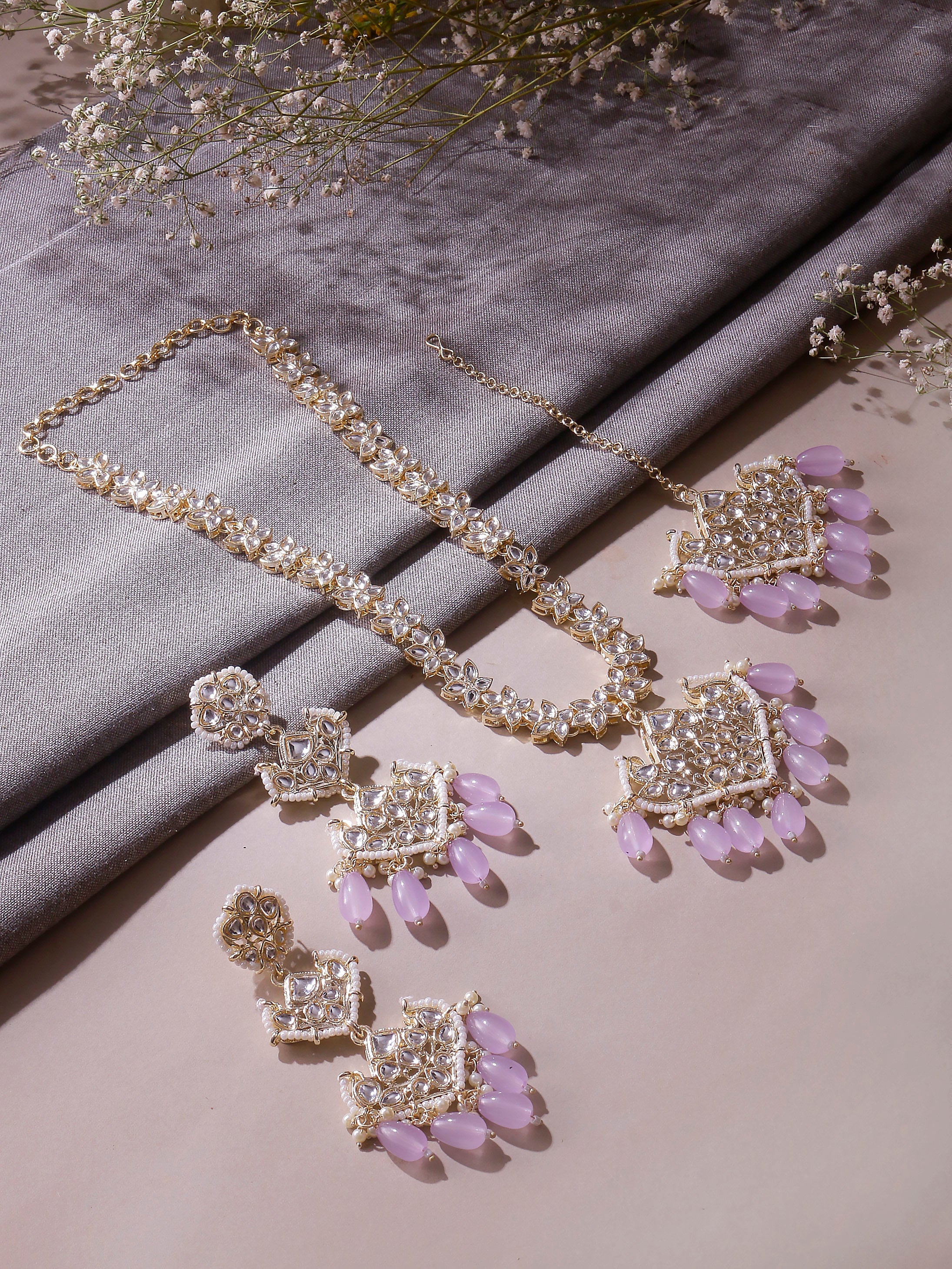 Swisni Alloy Golden Necklace, Earring, Maang Tikka Light Perple Beads Necklace Set For Women|For Girls|Gifting|Anniversary|Birthday|Girlfriend
