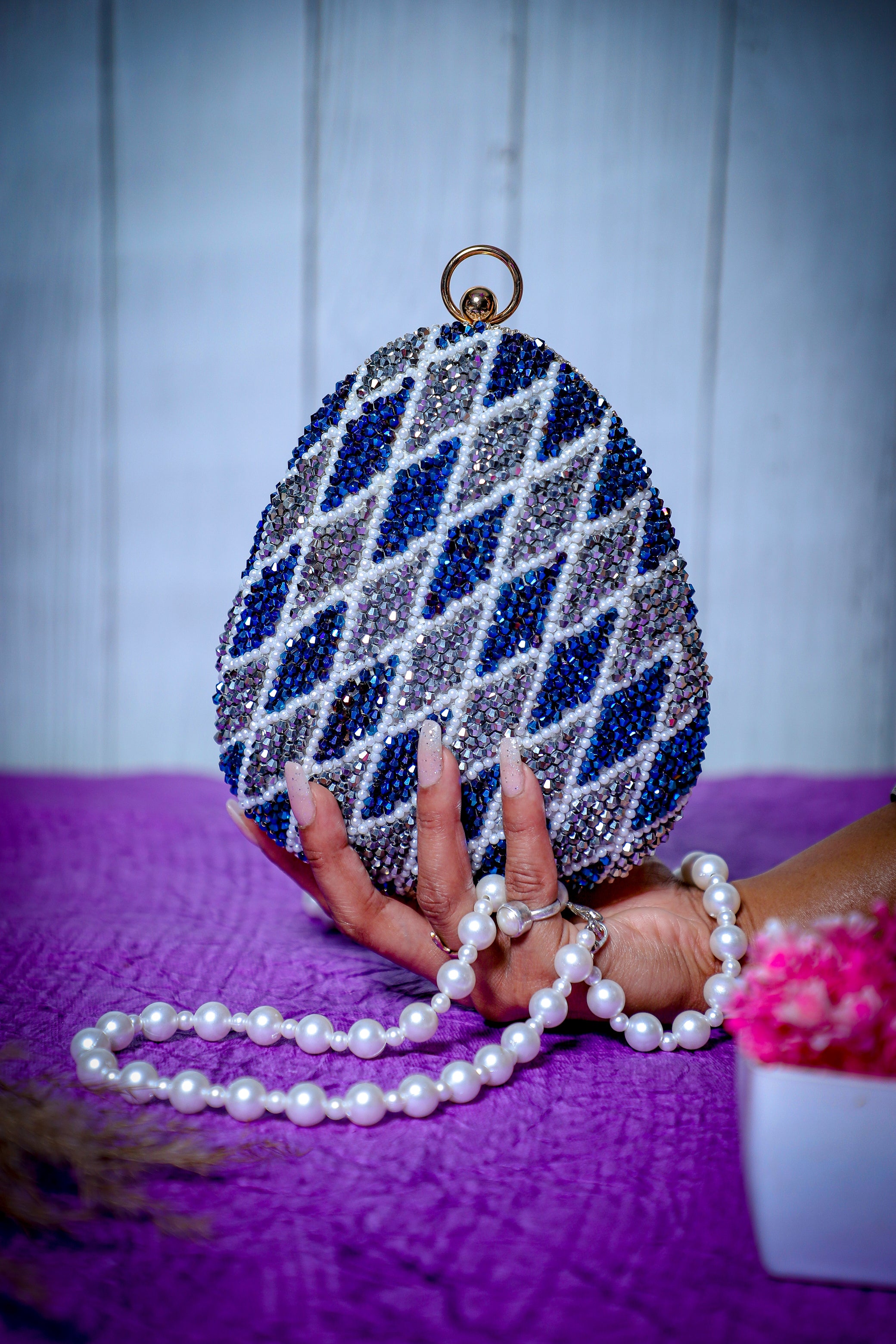 Exclusive Embroidered egg shape Designer blue-white clutch
