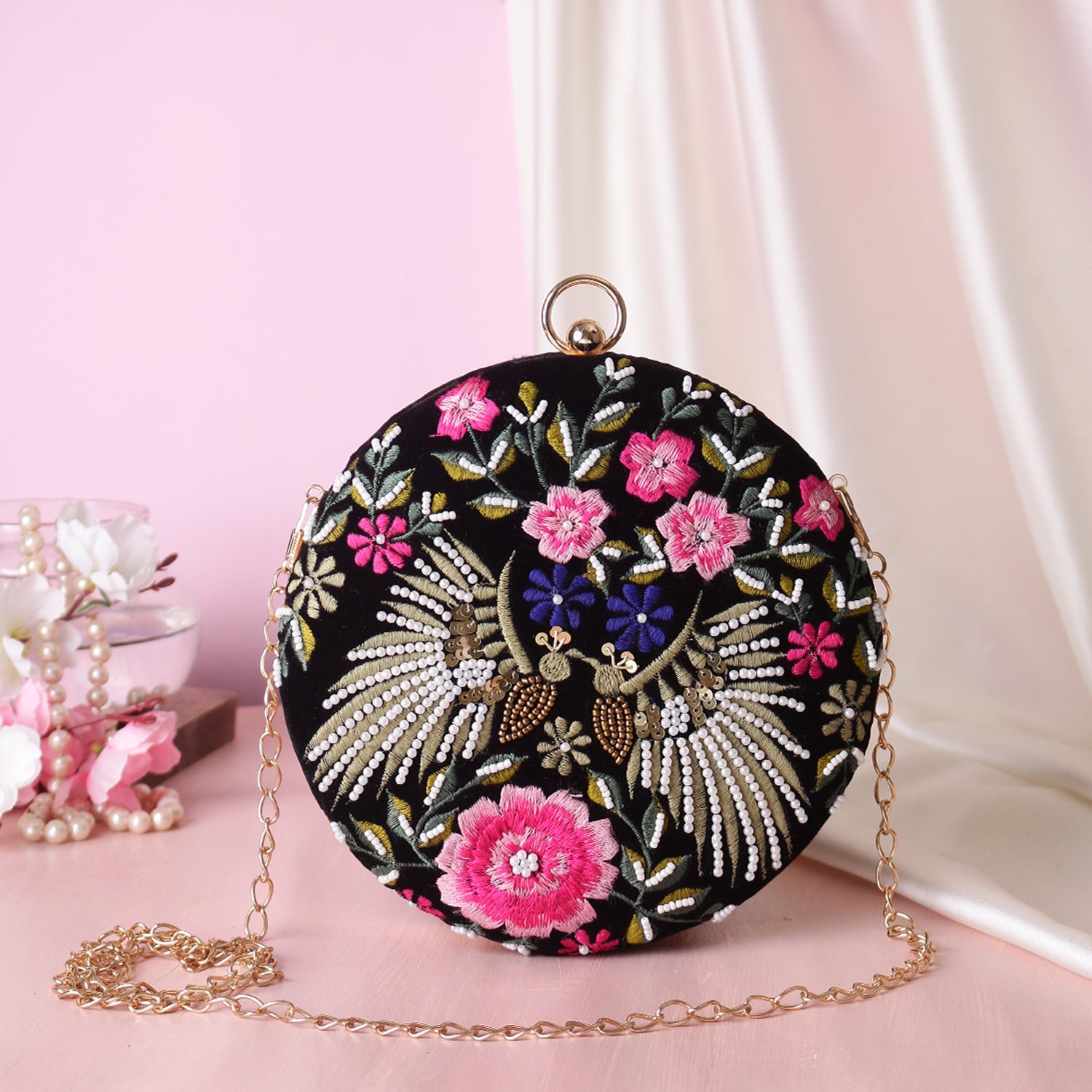 sparrow design embroidery round clutch