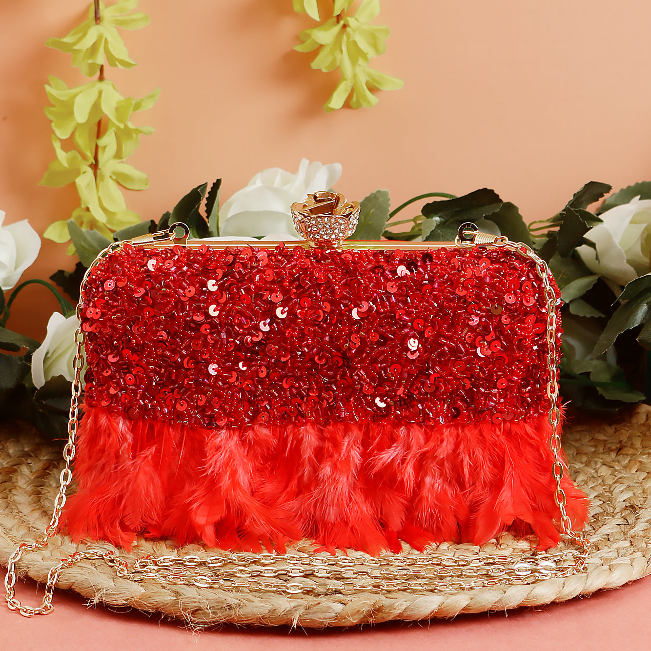 red feather clutch