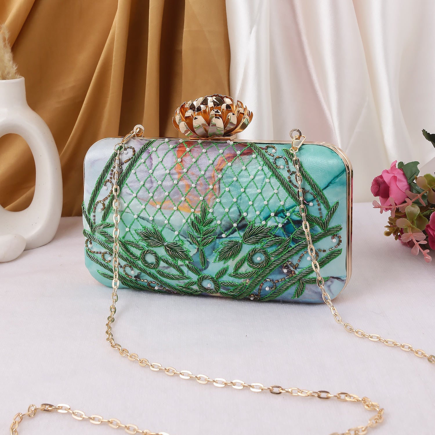 Swisni lotus knob embroidered clutch bag